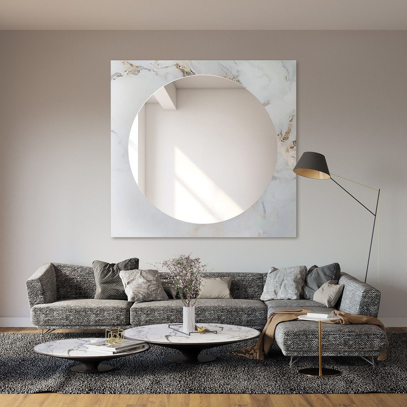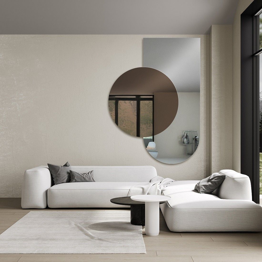 Geeignet sind geometrische Spiegel – Rechtecke, Quadrate, Kreise, Ovale und halbovale Portalspiegel. Es können auch asymmetrische oder geteilte Formen sein, ebenso Spiegel, die zwei Flächen verbinden, auch in verschiedenen Farben.