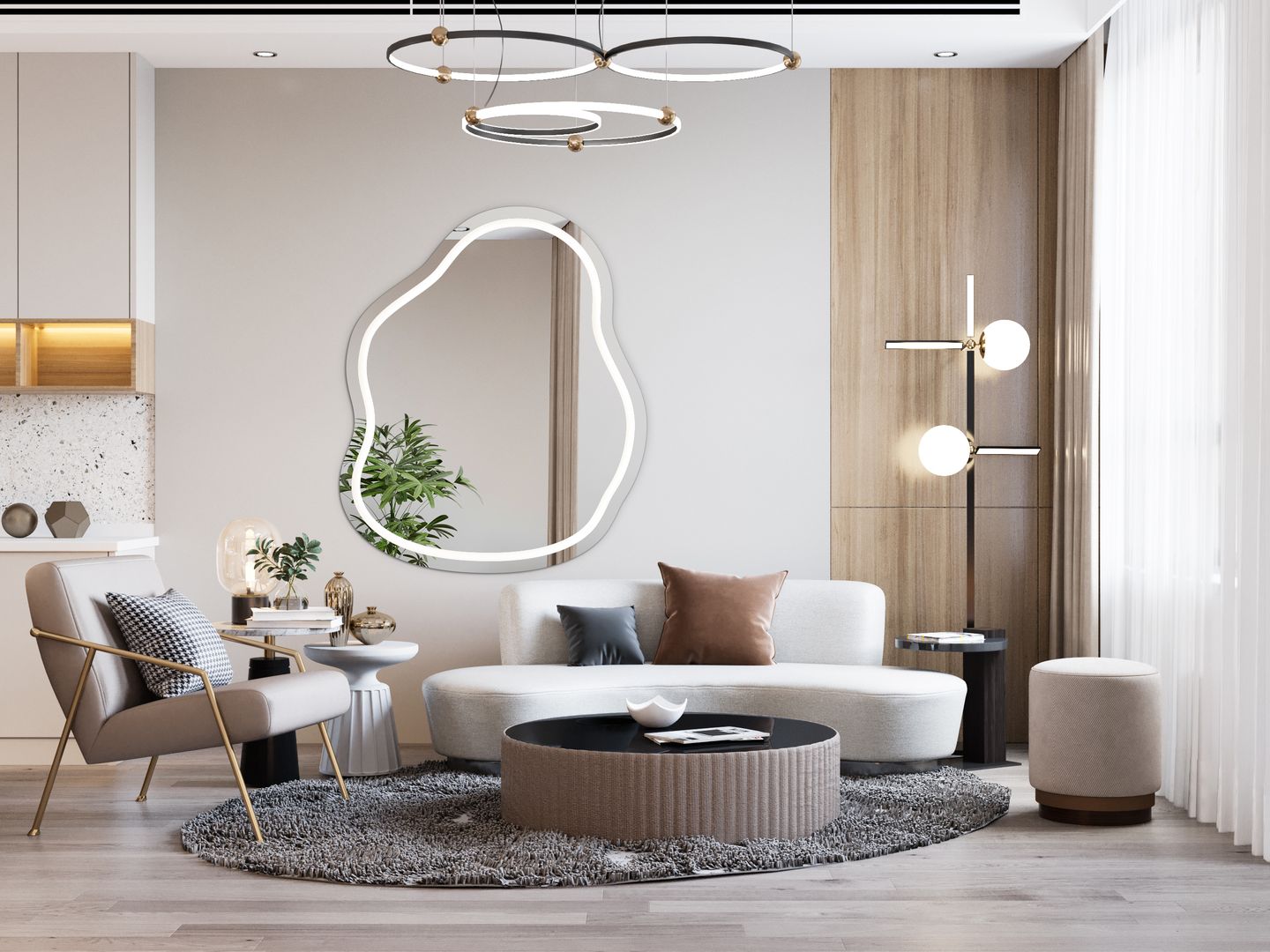 Vor allem die erwähnten Spiegel mit organischen Formen, die einen subtilen Effekt von Fließfähigkeit einbringen und scharfe Linien mildern. Sie beziehen sich von allen am stärksten auf Authentizität und Natur, indem sie deren Formen nachahmen, unter anderem eben Wolken. Sie knüpfen an Inspirationen durch deren Farbe und Bewegung an. Sie haben einen positiven Einfluss auf die Atmosphäre von Räumen, vermitteln ein Gefühl von Ruhe, Entschleunigung und Harmonie. All das, was die Farbe des Jahres 2026 in Innenräume einbringen soll. Darüber hinaus machen ihre einzigartigen Formen sie zu besonderen Dekorationen. Die Spiegelflächen kontrastieren subtil mit der Wärme des Weiß und zugleich mit der geometrischen Architektur des Raums. Ein ähnlicher Effekt lässt sich durch ovale und runde Spiegel erzielen. Auch sie besitzen sanfte Linien, die mit Weichheit und Fließfähigkeit assoziiert werden.