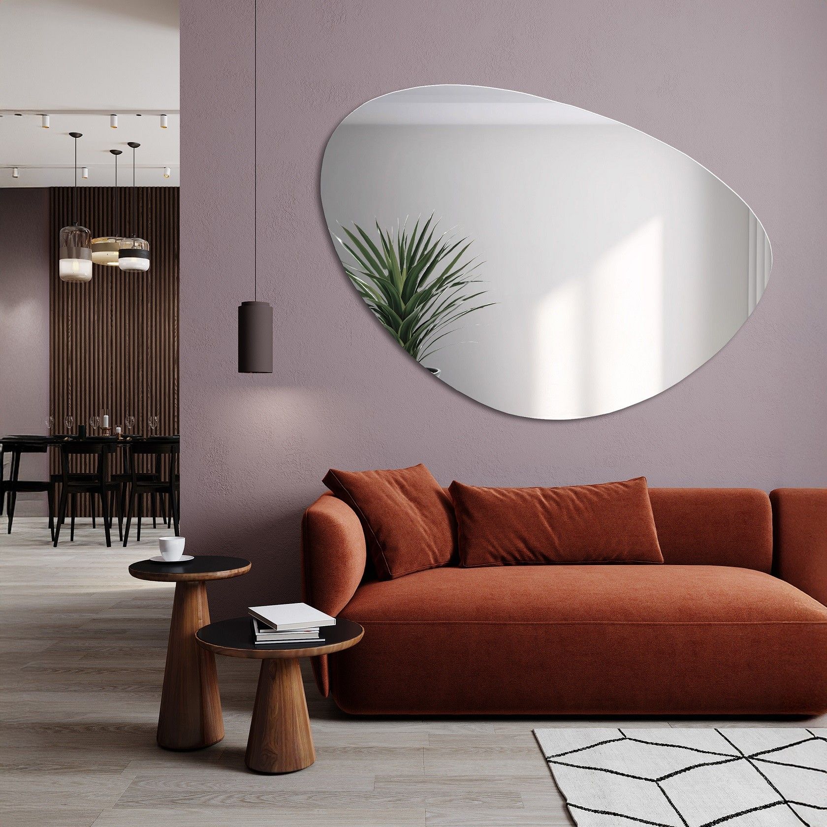 Was die Formen betrifft, dominieren vor allem Spiegel mit fließenden und organischen Formen, die auf die hier so wichtige Natur anspielen. Darüber hinaus große, runde Flächen, also geometrische Körper. Bei diesen geometrischen Formen sollte man Quadrate und Rechtecke eher vermeiden, wobei letztere in halbovaler oder ovaler Form gut zur Geltung kommen. Außerdem lohnt es sich, auf dreieckige sowie hexagonale und andere geometrische, aber unregelmäßige Spiegel zu achten. In diesem Stil kann man verschiedene Linien und Formen kombinieren, jedoch sollte man dies mit Maß tun und darauf achten, welche Elemente sich nahe beieinander befinden. Das ist wichtig in kleineren Räumen, obwohl Mid-century den offenen Grundriss liebt.