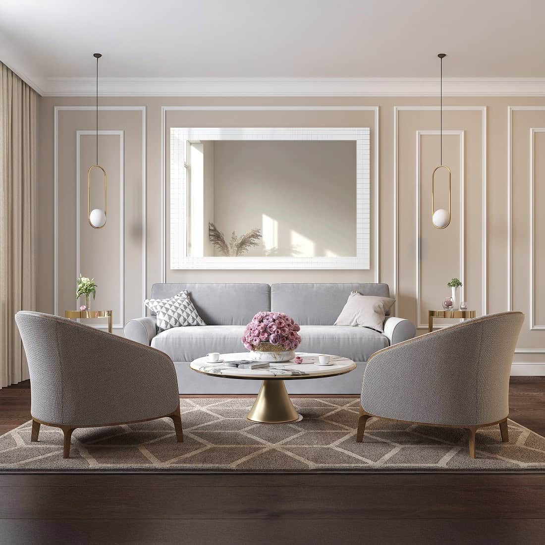 Zurück zum Spiegel auf Stuckatur: Man kann den von Fotos bekannten Passepartout-Effekt nutzen, also eine Art inneren Rahmen, der durch den Abstand der Spiegelfläche zu den Leisten entsteht. Das ist übrigens die beliebteste Art, diese beiden Elemente zu verbinden. Der Abstand kann an allen Seiten gleich oder unterschiedlich sein. Besser ist es jedoch, eine gewisse Symmetrie zu wahren und das Spiegelglas mittig im Paneel zu platzieren. In solchen Kompositionen funktioniert sogar ein rechteckiger Spiegel in einem quadratischen Rahmen und umgekehrt. Das ist visuell besonders vorteilhaft in Innenräumen, in denen gerade Linien dominieren.