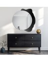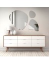 Auf dem Foto: Das Set aus drei unregelmäßig geformten Spiegeln FLORA mit einer schlichten Kommode und zwei Dekorationen, die gemeinsam ein minimalistisches Arrangement im modernen Stil schaffen. [Foto: ALFARAM]