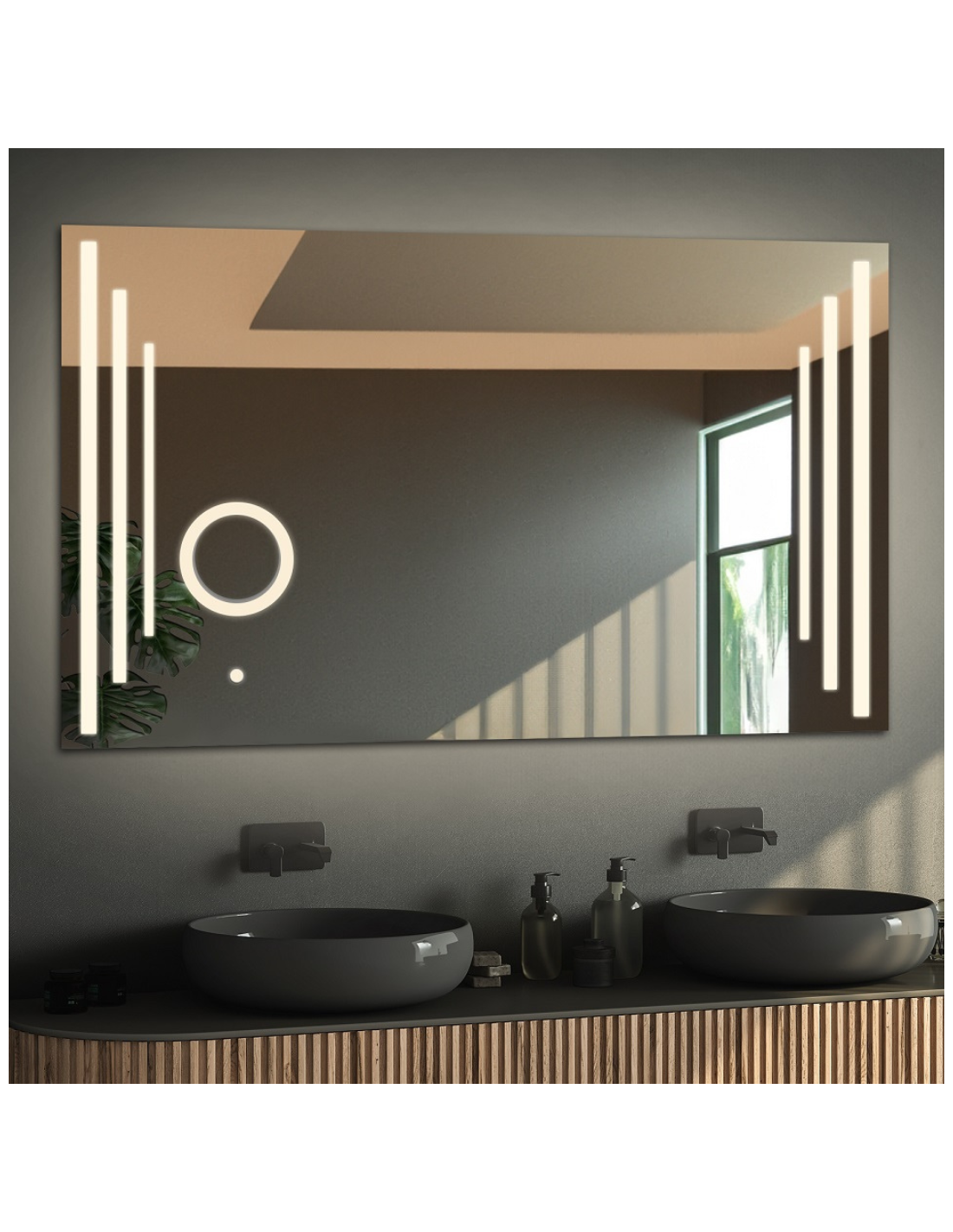 * Der Spiegel hat einen sandgestrahlten milchfarbenen LED-Streifen auf der Spiegeloberfläche. Die Breite des milchfarbenen sandgestrahlten Streifens wird je nach den Abmessungen des Spiegels angepasst.