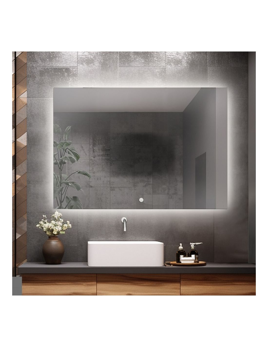 * Der Spiegel hat einen sandgestrahlten milchfarbenen LED-Streifen auf der Spiegeloberfläche. Die Breite des milchfarbenen sandgestrahlten Streifens wird je nach den Abmessungen des Spiegels angepasst.