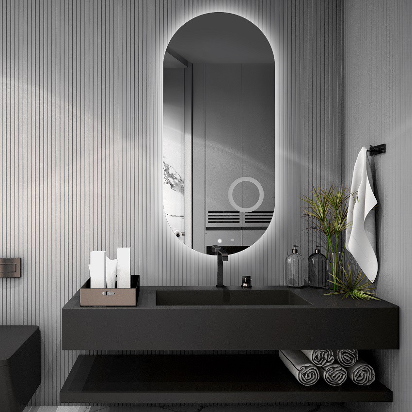 * Der Spiegel hat einen sandgestrahlten milchfarbenen LED-Streifen auf der Spiegeloberfläche. Die Breite des milchfarbenen sandgestrahlten Streifens wird je nach den Abmessungen des Spiegels angepasst.