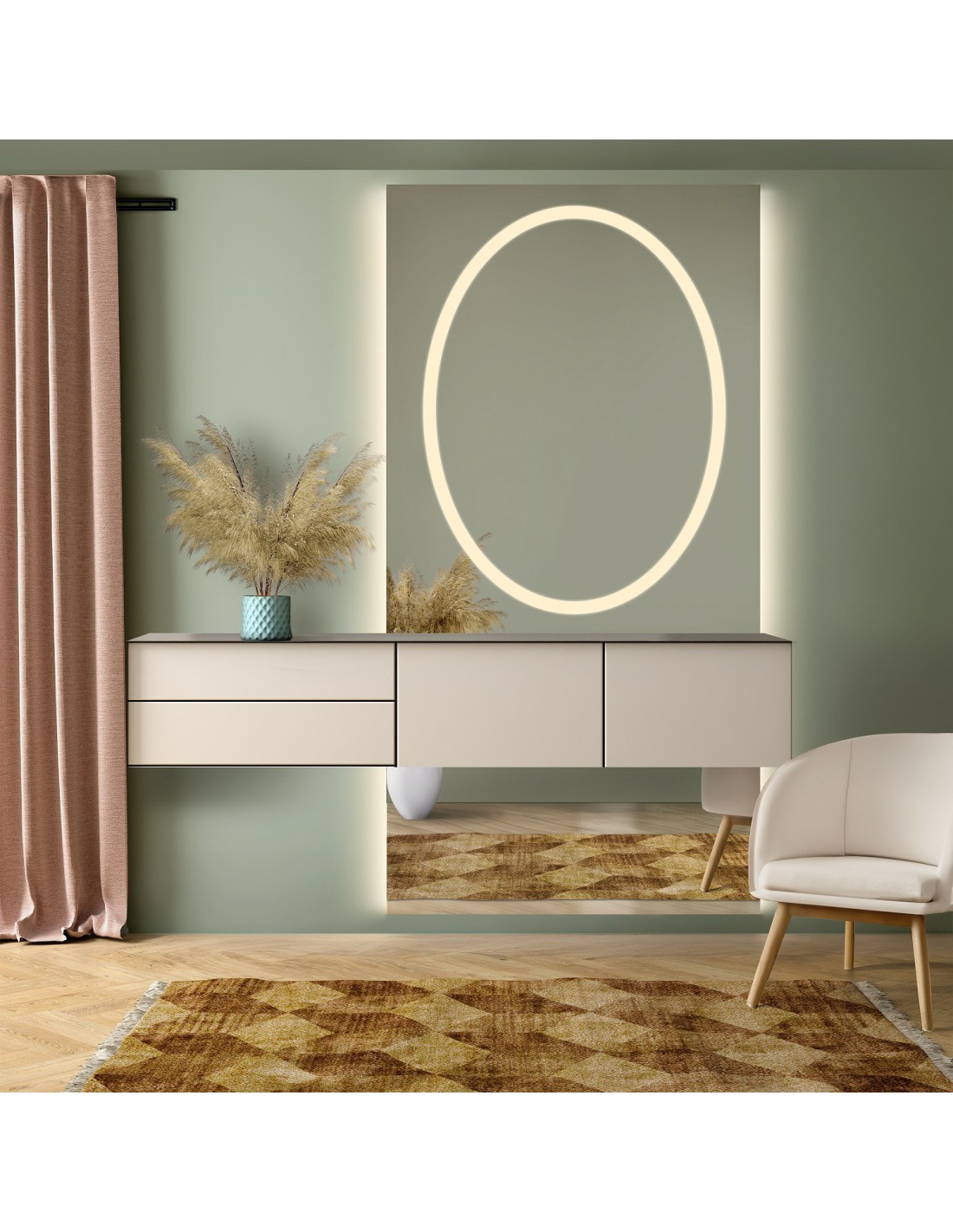 Die Standardbeleuchtung erzeugt einen Lichthof rund um den Spiegel. Bei Auswahl der LED-Verkleidung ist das Licht in einer speziellen Verkleidung integriert, was bedeutet, dass kein Lichthof um die Spiegelfläche entsteht. Bei der Auswahl der Beleuchtung für das tägliche Make-up ist die Wahl eines Zusatzes aus dieser Kategorie nicht möglich.