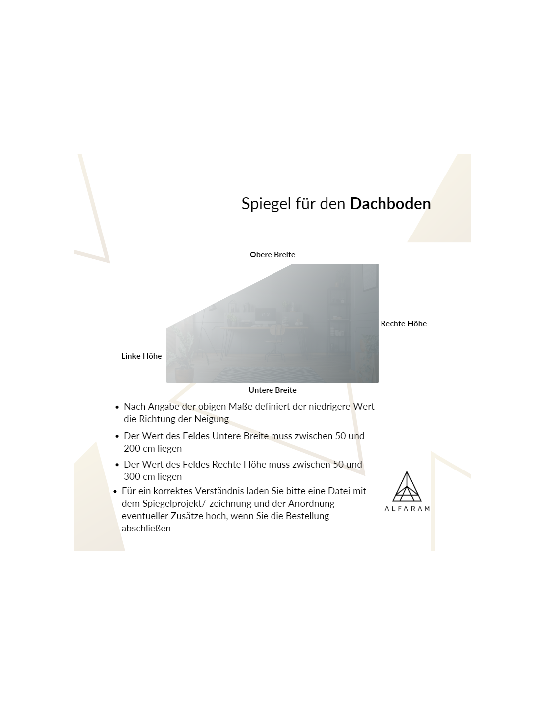 Haben Sie die erwartete Spiegelgröße nicht gefunden oder wünschen Sie sich einen anderen Spiegeltyp, kontaktieren Sie uns bitte telefonisch oder per E-Mail. Höchstabmessungen der zu bestellenden Spiegel liegen bei 200 x 300 cm. Bei Rundspiegeln kommt ein Durchmesser von maximal bis zu 200 cm in Frage. Spiegel werden nach Kundenwunsch gefertigt. Senden Sie uns, bitte, Ihre Anfragen mit den jeweiligen Entwürfen per E-Mail an spiegel@alfaram.at