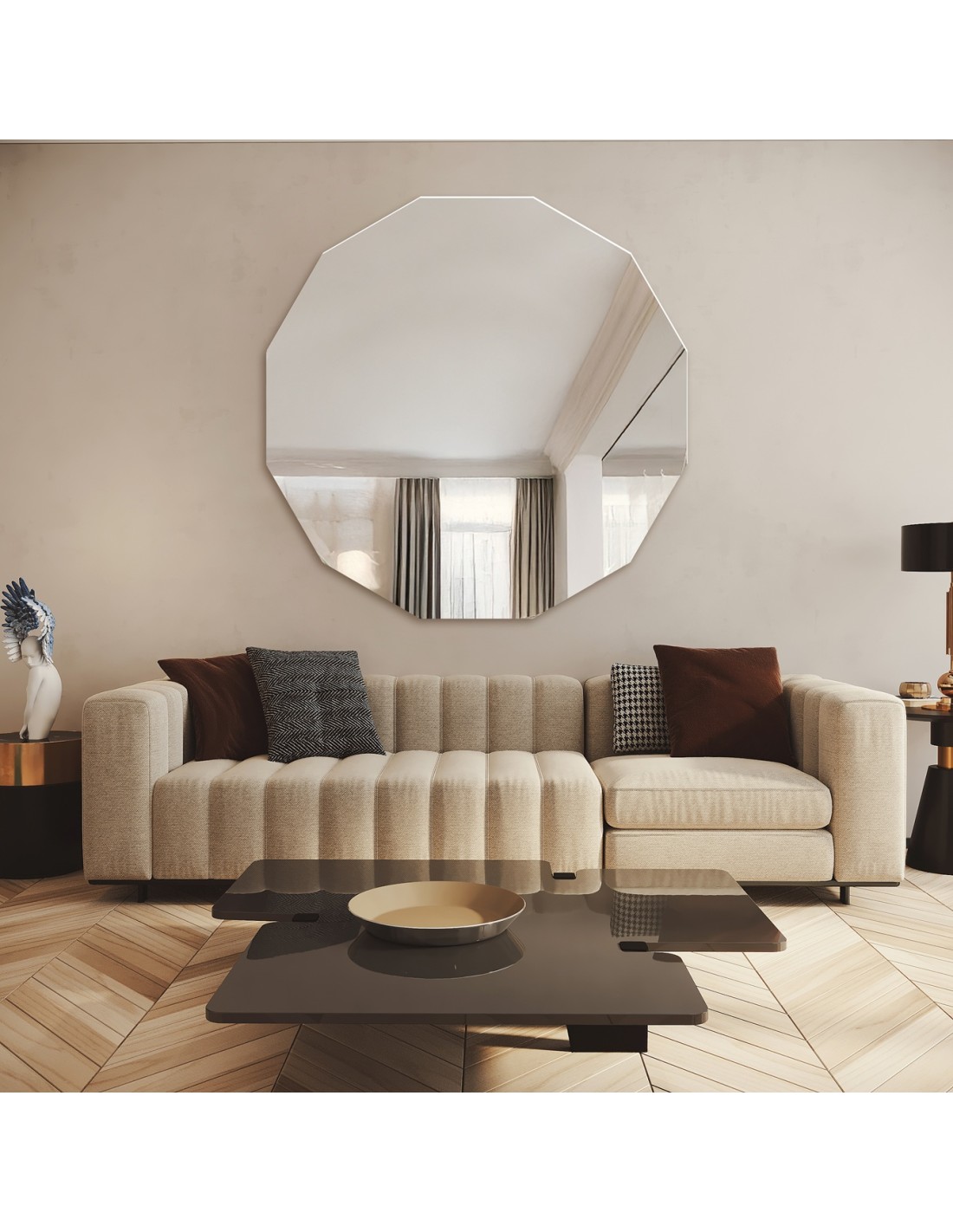 Diese einzigartige Spiegelglas zeichnet sich durch einen reichen, warmen Farbton aus, der dem Raum ein behagliches, gemütliches Gepräge verleiht. Der erdige Farbton bringt eine herzliche, einladende Stimmung in den Raum.